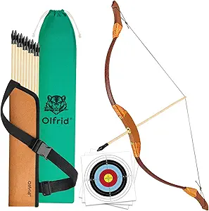 Superior Safety Design – The PU leather-covered grip prevents splinters, while soft rubber-tipped arrows ensure safe play.Complete Beginner’s Set – Includes a 34-inch wooden bow, 10 wooden arrows, 3 paper targets, a felt quiver, and a cotton storage bag for easy organization and transport.Comfortable & Adjustable Quiver – Features a strap for a secure fit, making it easy for kids to carry their arrows during play.Skill-Building Fun – Improves hand-eye coordination, motor skills, and teamwork through engaging bow and arrow games.Great for Indoor & Outdoor Play – Encourages active, social play with friends and family.