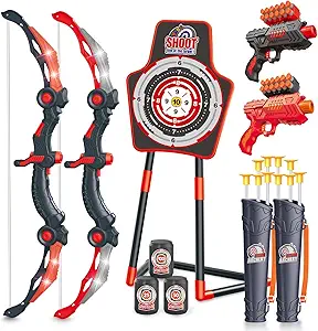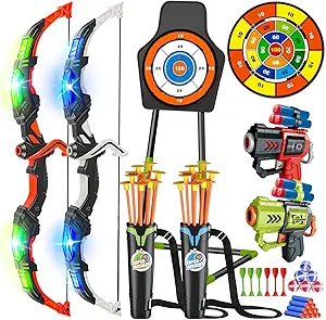 The bows feature built-in LED lights that turn on with 2 AA batteries (not included), allowing kids to track arrows during nighttime play, making every shot exciting.