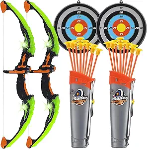 Bring the excitement of archery to your home with the 2-Pack Bow and Arrow Toy Set, designed to keep kids engaged and entertained for hours! This versatile set includes 2 LED-lit bows, 20 suction cup arrows, 2 adjustable quivers, 2 foam dart guns, 20 foam darts, and 2 different types of targets (a cup suction target and a sticky dartboard target), offering a variety of fun game options.